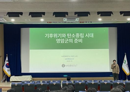 ‘2050탄소중립위원회’ 위원을 지낸 이유진 녹생환경연구소장은, 교육에서 ‘기후위기와 탄소중립 시대 영암군의 준비’를 주제로 강연했다.