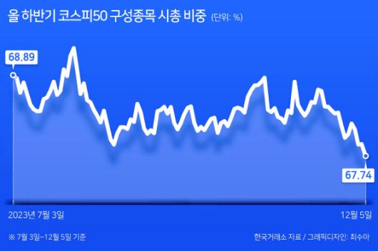 6일 한국거래소에 따르면, 유가증권시장에서 5일 기준 현재 시총 상위 50개사(1352조270억원)가 전체 시총(1995조8410억원)에서 차지하는 비중은 67.74%로 올 3월 9일(67.67%) 이후 9개월 만에 최저치를 기록했다. 50개사의 시총 비중은 지난해 연말 66.80%(12월 28일)까지 내렸다가 올 5월 말 70%(69.32%) 수준까지 불어나기도 했다.
