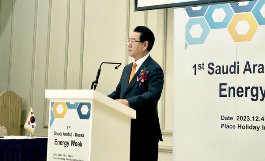 중동 아시아를 순방중인 김영록 전라남도지사가 4일(현지 시간) 사우디아라비아 수도 리야드서 열린 ‘2023 KOR-KSA 에너지 위크’ 행사에서 인사말을 하고 있다.@전남도청 |
