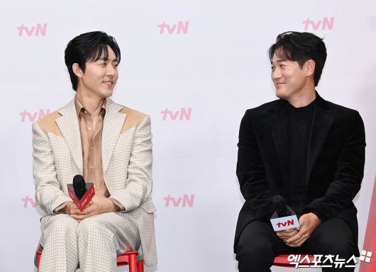 (엑스포츠뉴스 박지영 기자) 6일 오전 서울 신도림동 라마다서울신도림호텔에서 tvN 새 주말 드라마 '마에스트라' 제작발표회가 열렸다. 이날 행사에 참석한 배우 이무생과 김영재가 서로를 바라보고 있다.박지영 기자 jypark@xportsnews.com