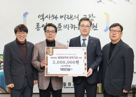 사진|철원군청 [스포츠서울ㅣ김기원기자]석미건설(주)심광일 회장, 오세철 이사는 12월6일 철원군청을 방문해 재단법인 철원장학회에 장학기금 500만원을 기탁했다.acdcok4021@sportsseoul.com [기사제보 news@sportsseoul.com] Copyright ⓒ 스포츠서울&sportsseoul.com