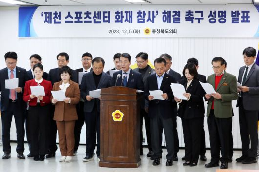 6일 충북도의회 등에 따르면 제천 지역구 김호경·김꽃임 의원을 포함한 17명의 도의원들은 전날 도의회에서 제천 스포츠센터 화재 참사 해결 촉구 공동성명을 발표했다.