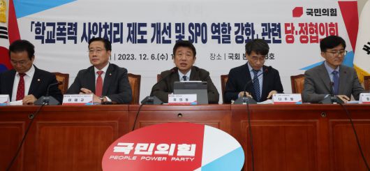 당정은 6일 오전 국회에서 ‘학교폭력 사안 처리 제도 개선 및 SPO 역할 강화’ 관련 당정협의회를 열고 이같은 내용을 논의했다. 이날 협의회에는 유의동 국민의힘 정책위의장, 이태규 정책위수석부의장 겸 교육위원회 간사, 김용판 제3정책조정위원장 겸 행정안전위원회 간사 나주범 교육부 차관 직무대리, 정영준 행정안전부 기획조정실장, 조지호 경찰청 차장 등이 참석했다.