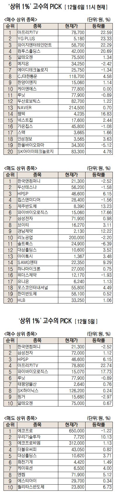 이날 미래에셋엠클럽에 따르면 미래에셋증권 주식 거래 고객 중 최근 1개월 간 투자수익률 상위 1%에 해당하는 ‘주식 초고수’들이 오전 11시까지 가장 많이 사들인 종목은 아프리카TV로 집계됐다.
