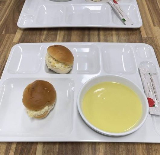 글쓴이 A씨는 "가격은 5천원(식권 강제구매), 빠진 음식 없음 다들 아침 먹고 힘내세요"라며 사진 한 장을 첨부, 공개된 사진 속 식판에는 감자 샐러드를 바른 모닝빵 두개와 스프, 딸기잼이 담겨 있다.