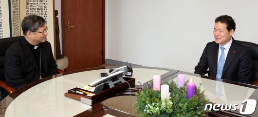 (서울=뉴스1) 김진환 기자 = 정순택 천주교 서울대교구장이 6일 오전 서울 중구 명동 서울대교구청에서 예방 온 김영호 통일부 장관(오른쪽)과 대화를 나누고 있다. 2023.12.6/뉴스1kwangshinQQ@news1.krCopyright ⓒ 뉴스1. All rights reserved. 무단 전재 및 재배포, AI학습 이용 금지.