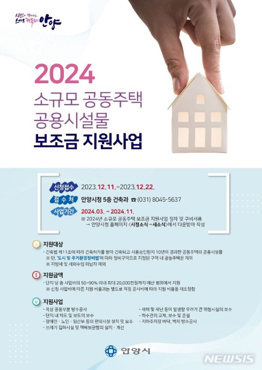 [안양=뉴시스] 박석희 기자 = 경기 안양시가 ‘2024년 소규모 공동주택 공용시설물 보조금 지원사업’을 추진하는 가운데 오는 11일부터 22일까지 희망자 신청을 받는다. 신청은 입주자대표회의 의결 또는 입주자 3분의 2 이상의 동의를 받은 대표자가 할 수 있다.