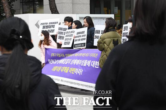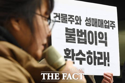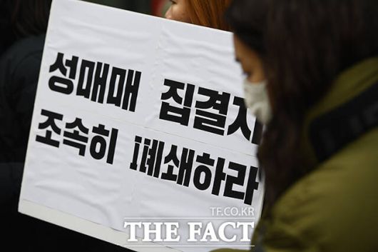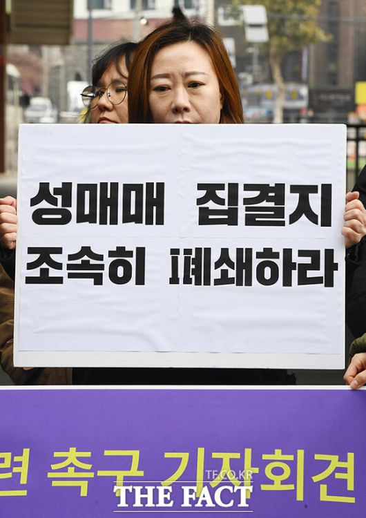 [더팩트ㅣ장윤석 기자] 성매매문제해결을위한전국연대 부설 여성인권센터 회원들이 6일 오전 서울 성북구 성북구청 앞에서 '성매매 집결지 폐쇄 대책 마련 촉구 기자회견'을 열고 구호를 외치고 있다.