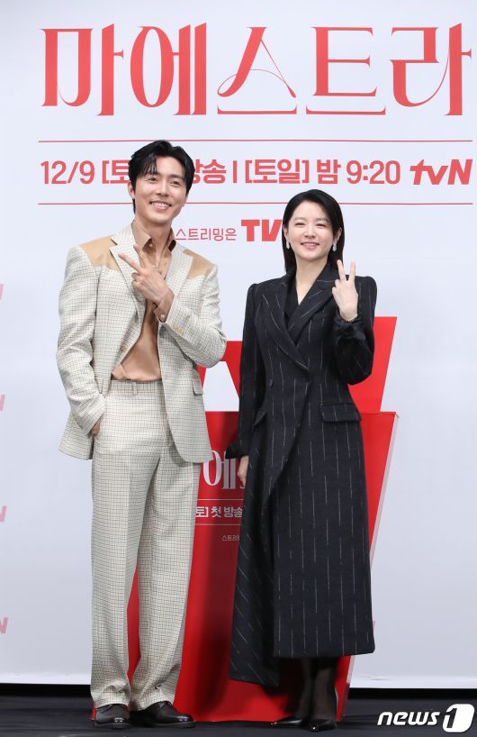 (서울=뉴스1) 권현진 기자 = 배우 이무생과 이영애(오른쪽)가 6일 서울 구로구 라마다 서울신도림호텔에서 열린 tvN 새 토일드라마 '마에스트라'(감독 김정권) 제작발표회에서 포즈를 취하고 있다. '마에스트라'는 전 세계 단 5%뿐인 여성 지휘자 마에스트라 천재 혹은 전설이라 불리는 차세음(이영애 분)이 자신의 비밀을 감춘 채 오케스트라를 둘러싼 사건의 진실을 찾아가는 미스터리 드라마다. 2023,12,6/뉴스1
