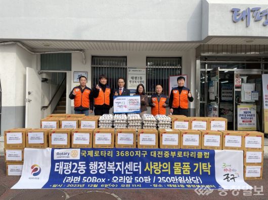 국제로터리 3680지구 대전중부로터리클럽이 취약계층의 따뜻한 겨울나기를 위해 250만원 상당의 라면 50상자와 오리알 50판을 대전시 중구 태평2동에 기탁했다.
