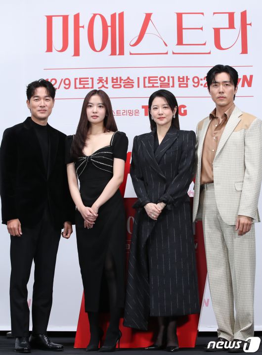 (서울=뉴스1) 권현진 기자 = 배우 김영재(왼쪽부터)와 황보름별, 이영애, 이무생이 6일 서울 구로구 라마다 서울신도림호텔에서 열린 tvN 새 토일드라마 '마에스트라'(감독 김정권) 제작발표회에서 포즈를 취하고 있다. '마에스트라'는 전 세계 단 5%뿐인 여성 지휘자 마에스트라 천재 혹은 전설이라 불리는 차세음(이영애 분)이 자신의 비밀을 감춘 채 오케스트라를 둘러싼 사건의 진실을 찾아가는 미스터리 드라마다. 2023,12,6/뉴스1