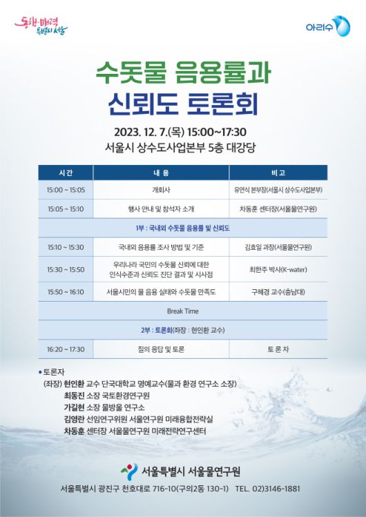 주제 발표 후에는 현인환 단국대학교 명예교수가 좌장을 맡아 수돗물 음용률 기준 정립 필요성에 대해 전문가 토론과 질의응답을 진행한다. 토론에는 최동진 국토환경연구원 소장, 가길현 물방울 연구소 소장, 김영란 서울연구원 선임연구위원, 차동훈 서울물연구원 미래전략연구센터장이 참여한다.