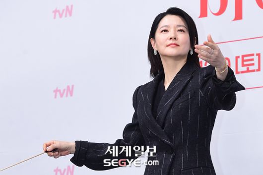 배우 이영애가 6일 오전 서울 구로구 라마다 서울 신도림 호텔에서 열린 tvN 새 토일드라마 '마에스트라'의 제작발표회에 참석해 포즈를 취하고 있다.