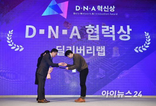 '제4회 아이뉴스24 D·N·A 혁신상' 시상식이 6일 서울 용산구 드래곤시티 호텔 3층 한라홀에서 열린 가운데 딜리버리랩 이원석 대표가 한국지능정보사회진흥원장상인 D·N·A 협력상을 수상하고 있다. [사진=곽영래 기자] |