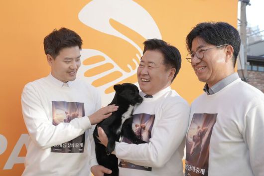 오영훈 제주지사가 지난달 20일 서울 마포구 포인핸드 입양문화센터에서 포인핸드, 티웨이항공과 ‘날개를 달아줄개’ 프로젝트로 제주도 유기동물 입양 활성화를 위한 업무협약(MOU)을 맺고 유기견을 안고 활짝 웃고 있다. 제주도 제공 |