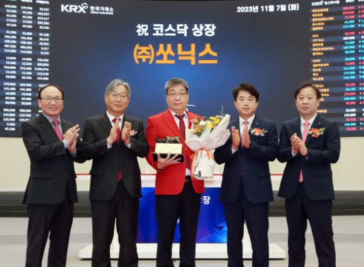 한국거래소 코스닥시장본부가 지난달 7일 개최한 쏘닉스의 코스닥시장 상장기념식에서 강왕락 코스닥협회 부회장(왼쪽부터), 홍순욱 한국거래소 코스닥시장본부장, 양형국 쏘닉스 대표이사, 박성원 KB증권 IB영업총괄 부사장, 유도석 한국IR협의회 상무가 참석했다. (사진=쏘닉스) |