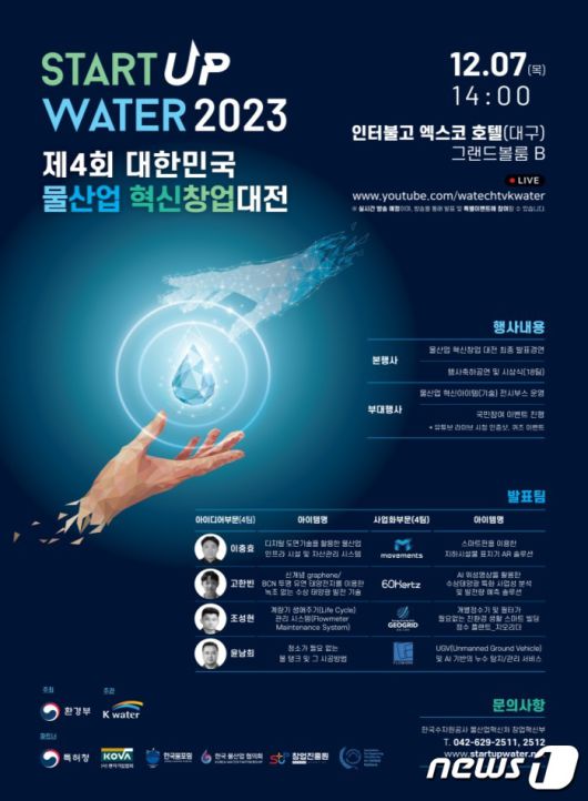(서울=뉴스1) 황덕현 기후환경전문기자 = 환경부는 6~9일 열리고 있는 '대한민국 국제물주간'과 연계해서 7일 대구 북구 인터불고 엑스코호텔에서 '제4회 대한민국 물산업 혁신창업 대전'을 개최한다고 6일 밝혔다.