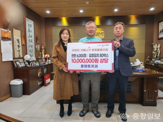 대전시 대덕구 대화동이 유성구 봉명동 플랜트치과로부터 저소득 취약계층을 위한 1000만원 상당의 연탄 6000장과 김장 김치 10kg 80상자를 기탁받았다.