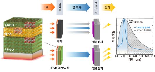 특히 LBSO는 열광전지(TVP)로의 가능성이 확인됐다. 열광전지는 태양 빛으로 전기를 생산하는 태양전지와 다르게 뜨거운 물체에서 나오는 광자로 전기를 생산한다. 일반적으로 물체가 열을 흡수하면 매우 넓은 파장대의 복사에너지를 방출해 효율이 떨어지는데, LBSO는 파장대를 선택해 열을 방사해 발전 효율이 높다. 연구팀은 LBSO를 다층 박막 구조로 제작한 결과, 열과 빛에 대한 안정성을 가진다고 강조했다. 소재가 산화하는 것을 막기 위해 추가적인 과정 없이 열복사를 열광전지 셀에 전달할 수 있다는 설명이다.