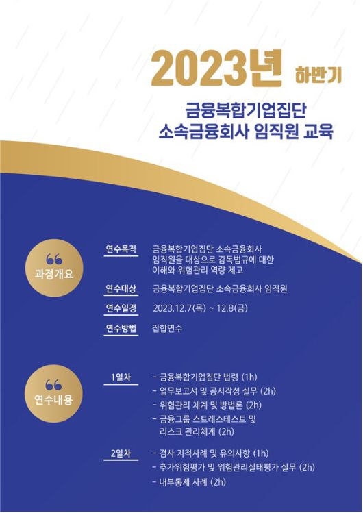 [이데일리 서대웅 기자] 금융위원회와 금융감독원은 금융복합기업집단 소속 금융회사 임직원을 대상으로 2023년 하반기 교육과정을 개설했다고 6일 밝혔다. 교육은 오는 7~8일 서울 삼청동 한국금융연수원에서 실시한다.