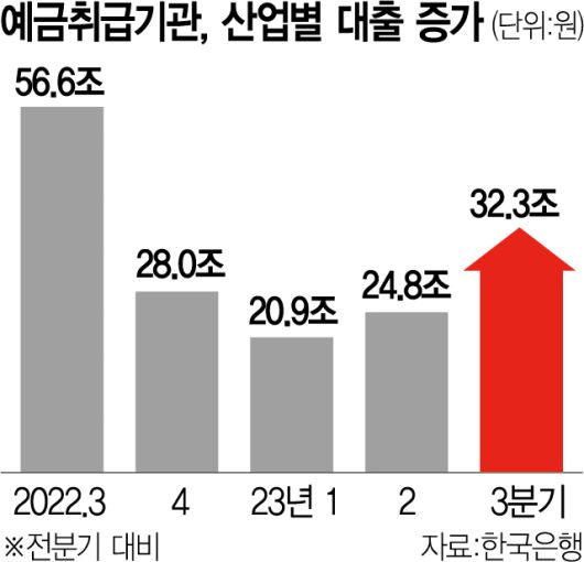 서비스업은 금융·보험업과 부동산업 등을 중심으로 16조 9000억 원 늘면서 전 분기보다 증가 폭이 확대됐다. 금융·보험업은 7000억 원 늘었는데 증권사의 예금은행 차입이 확대된 결과다. 부동산업은 부동산 개발사업이 진척되는 가운데 상업용 부동산 거래가 이뤄지면서 대출이 실행되며 8조 원 늘었다. 신규 착공은 늘지 않지만 재건축이나 프로젝트파이낸싱(PF) 등 건설 기성이 진행되면서 대출도 함께 이뤄지는 상황이다. 건설업 대출도 2조 원 늘었는데 이는 건설 원가 상승으로 자금 수요가 발생했기 때문이다.
