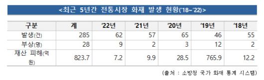 소방청 국가화재통계시스템 자료에 따르면, 최근 5년 간 전통시장에서 발생한 화재는 총 285건으로, 이로 인해 28명이 다치고 820억 원에 달하는 재산 피해가 발생했다.