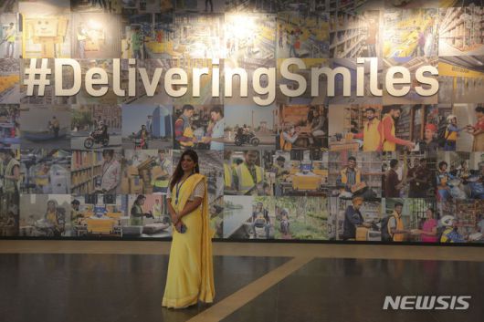 [하이데라바드=AP/뉴시스]2019년 8월 인도 하이데라바드 지방에 있는 아마존(Amazon)의 새로 개관한 캠퍼스 건물에 인도 직원이 서 있는 모습. |