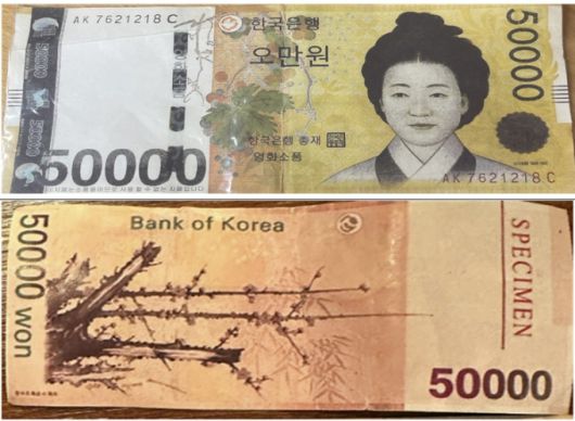 한국은행이 최근 '영화소품', 'SPECIMEN(견본)' 등 문구가 포함된 위폐가 제작돼 전통시장 및 노점상 등에 많이 유통되고 있다며 각별한 주의가 필요하다고 밝혔다.
