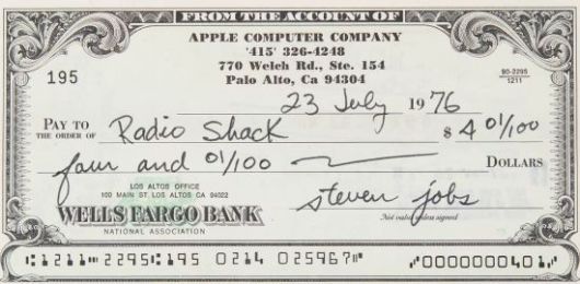 이 수표는 전자제품 전문 유통업체 '라디오쉑'에 보내진 것이다. 일반 수표와 다른 점은 잡스가 직접 서명했다는 것이다. 비즈니스인사이더는 "잡스는 사인을 하지 않는 것으로 유명하다"라고 설명했다. 이 수표를 누가 내놓았는지 등은 공개되지 않았다.
