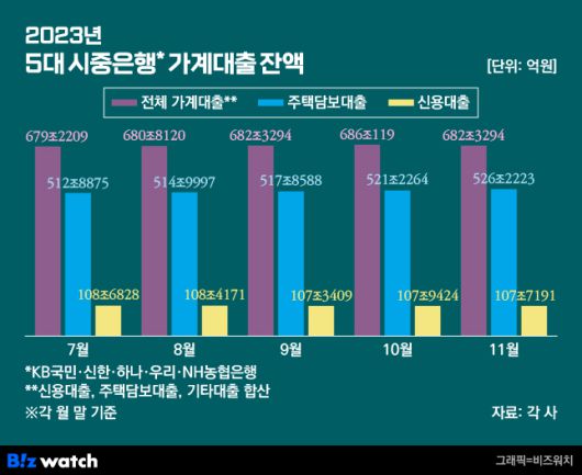 5대 시중은행 가계대출 잔액 /그래픽=비즈워치 |