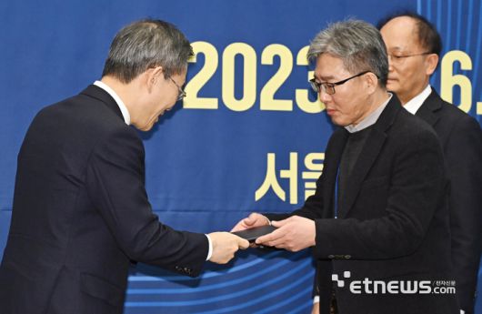 제1회 스마트빌리지 챔피언 페스타가 과학기술정보통신부 주최, 한국지능정보사회진흥원(NIA) 주관으로 6일 서울 중구 LW컨벤션에서 열렸다. 이종호 과기정통부 장관이 스마트빌리지 챔피언에 선정된 완주군에 시상하고 있다. 이동근기자 foto@etnews.com [Copyright © 전자신문. 무단전재-재배포금지]
