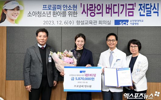 (엑스포츠뉴스 김한준 기자) 6일 오전 서울 한남동 순천향대학교 부속 서울병원에서 '안소현 프로골퍼 소아청소년 환아를 위한 '사랑의 버디기금' 전달식이 진행됐다. 이날 전달식에 참석한 프로골퍼 안소현이 순천향대학교 서울병원 이정재 원장 및 관계자들과 함께 포즈를 취하고 있다.김한준 기자 kowel@xportsnews.com