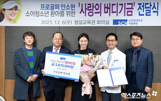 (엑스포츠뉴스 김한준 기자) 6일 오전 서울 한남동 순천향대학교 부속 서울병원에서 '안소현 프로골퍼 소아청소년 환아를 위한 '사랑의 버디기금' 전달식이 진행됐다. 이날 전달식에 참석한 프로골퍼 안소현이 이준식 팬카페 , 후원회 김민식 회장, 순천향대학교 서울병원 이정재 원장, 문자온 유인식대표(좌측부터)와 함께 포즈를 취하고 있다.김한준 기자 kowel@xportsnews.com