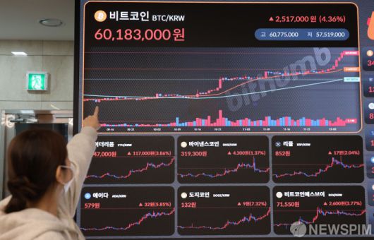 [서울=뉴스핌] 양윤모 기자 = 비트코인 현물 ETF가 이르면 내년 1월경 미 SEC 승인을 받을 수 있다는 전망과 미국의 금리 인하 기대감으로 가상자산시장에도 긍정적으로 작용하고 있는 가운데 6일 오전 가상화폐 거래소 빗썸에서 관계자가 6천만원 돌파한 비트코인 시세판을 살피고 있다. 2023.12.06 yym58@newspim.com