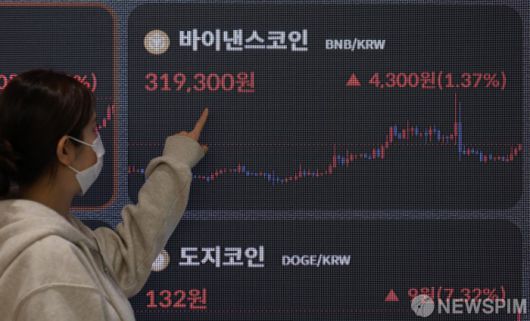 [서울=뉴스핌] 양윤모 기자 = 비트코인 현물 ETF가 이르면 내년 1월경 미 SEC 승인을 받을 수 있다는 전망과 미국의 금리 인하 기대감으로 가상자산시장에도 긍정적으로 작용하고 있는 가운데 6일 오전 가상화폐 거래소 빗썸에서 관계자가 바이낸스코인 시세판을 살피고 있다. 2023.12.06 yym58@newspim.com