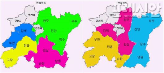 ▲사진 왼쪽: 현행 전북 국회의원 선거구, 사진 오른쪽: 국회선거구획정위가 국회에 제출한 조정안, 임실순창남원선거구가 뿔뿔이 흩어지면서 전북에서는 1석이 줄어들게 된다. ⓒ프레시안 |