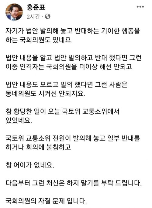 홍 시장은 5일 밤 페이스북에 법안 국회 계류와 관련 “자기가 법안 발의해놓고 반대하는 기이한 행동을 하는 국회의원도 있다”면서 강한 불만을 표출했다.