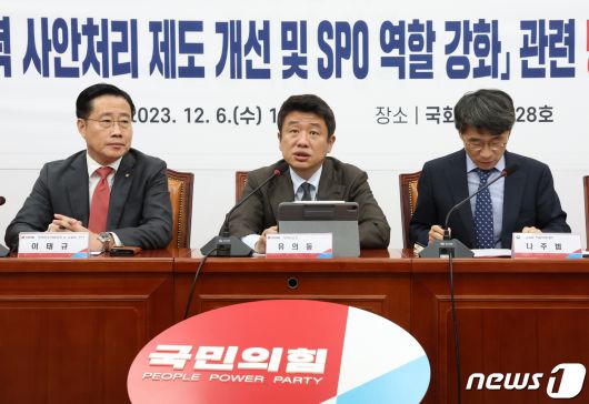 (서울=뉴스1) 송원영 기자 = 유의동 국민의힘 정책위의장이 6일 서울 여의도 국회에서 열린 '학교폭력 사안처리 제도 개선 및 SPO 역할 강화' 당정협의회에서 발언을 하고 있다. 2023.12.6/뉴스1