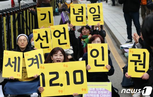 (서울=뉴스1) 허경 기자 = 6일 서울 종로구 평화로 일본대사관 인근에서 열린 제1625차 일본군성노예제 문제해결을 위한 정기 수요시위에서 참석자들이 12·10 세계인권선언기념일 손팻말을 들고 있다. 2023.12.6/뉴스1neohk@news1.krCopyright ⓒ 뉴스1. All rights reserved. 무단 전재 및 재배포, AI학습 이용 금지.