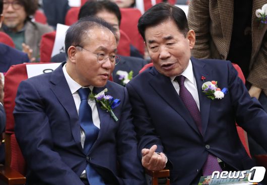 (서울=뉴스1) 임세영 기자 = 김진표 국회의장과 윤재옥 국민의힘 원내대표가 6일 오전 서울 여의도 국회 의원회관에서 열린 2023 제5회 대한민국 동물복지대상 시상식에서 대화를 하고 있다. 2023.12.6/뉴스1seiyu@news1.krCopyright ⓒ 뉴스1. All rights reserved. 무단 전재 및 재배포, AI학습 이용 금지.