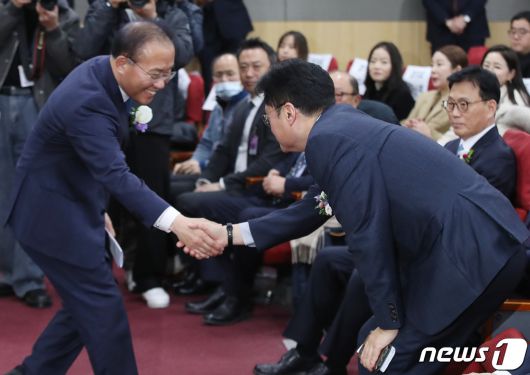 (서울=뉴스1) 임세영 기자 = 윤재옥 국민의힘 원내대표와 홍익표 더불어민주당 원내대표가 6일 오전 서울 여의도 국회 의원회관에서 열린 2023 제5회 대한민국 동물복지대상 시상식에서 악수를 나누고 있다. 2023.12.6/뉴스1seiyu@news1.krCopyright ⓒ 뉴스1. All rights reserved. 무단 전재 및 재배포, AI학습 이용 금지.