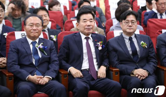 (서울=뉴스1) 임세영 기자 = 김진표 국회의장과 윤재옥 국민의힘 원내대표, 홍익표 더불어민주당 원내대표가 6일 오전 서울 여의도 국회 의원회관에서 열린 2023 제5회 대한민국 동물복지대상 시상식에 참석해 앉아 있다. 2023.12.6/뉴스1seiyu@news1.krCopyright ⓒ 뉴스1. All rights reserved. 무단 전재 및 재배포, AI학습 이용 금지.