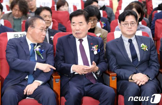 (서울=뉴스1) 임세영 기자 = 김진표 국회의장과 윤재옥 국민의힘 원내대표, 홍익표 더불어민주당 원내대표가 6일 오전 서울 여의도 국회 의원회관에서 열린 2023 제5회 대한민국 동물복지대상 시상식에서 대화를 하고 있다. 2023.12.6/뉴스1