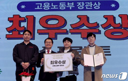 (서울=뉴스1) 장수영 기자 = 이정식 고용노동부 장관이 6일 오전 서울 종로구 JW메리어트 동대문 스퀘어에서 열린 2023 미래내일 일경험 컨퍼런스에서 우리는 전부팀에게 프로젝트 결과물 최우수상을 수여하고 있다. 2023.12.6/뉴스1presy@news1.krCopyright ⓒ 뉴스1. All rights reserved. 무단 전재 및 재배포, AI학습 이용 금지.