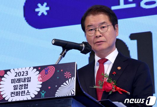 (서울=뉴스1) 장수영 기자 = 이정식 고용노동부 장관이 6일 오전 서울 종로구 JW메리어트 동대문 스퀘어에서 열린 2023 미래내일 일경험 컨퍼런스에서 기념사를 하고 있다. 2023.12.6/뉴스1