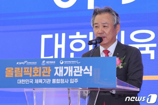 (서울=뉴스1) 신웅수 기자 = 이기흥 대한체육회장이 6일 서울 송파구 올림픽회관에서 열린 재개관 행사에서 인사말을 하고 있다. 4년간의 공사를 마치고 이날 공식 재개관한 올림픽회관에는 국민체육진흥공단과 대한체육회, 대한장애인체육회를 비롯한 61개 종목 단체와 기타 체육 단체들이 차례대로 들어와 이달 말 입주를 마칠 예정이다. 2023.12.6/뉴스1