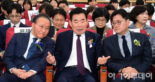 아시아투데이 이병화 기자 = 김진표 국회의장과 윤재옥 국민의힘 원내대표, 홍익표 더불어민주당 원내대표가 6일 국회 의원회관에서 열린 제5회 대한민국 동물복지대상에서 대화를 나누고 있다. ⓒ "젊은 파워, 모바일 넘버원 아시아투데이"