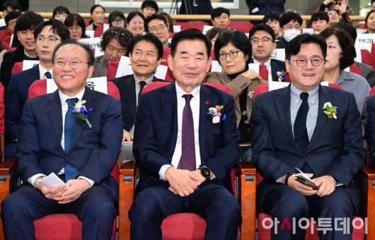 아시아투데이 이병화 기자 = 김진표 국회의장과 윤재옥 국민의힘 원내대표, 홍익표 더불어민주당 원내대표가 6일 국회 의원회관에서 열린 제5회 대한민국 동물복지대상에 참석해 있다.