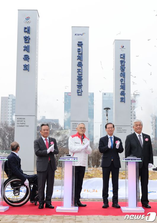 (서울=뉴스1) 신웅수 기자 = 유인촌 문화체육관광부 장관(가운데)이 6일 서울 송파구 올림픽회관에서 열린 재개관 행사에서 참석자들과 입간판을 제막한 후 손뼉을 치고 있다. 4년간의 공사를 마치고 이날 공식 재개관한 올림픽회관에는 국민체육진흥공단과 대한체육회, 대한장애인체육회를 비롯한 61개 종목 단체와 기타 체육 단체들이 차례대로 들어와 이달 말 입주를 마칠 예정이다. 왼쪽부터 정진완 대한장애인체육회 회장, 이기흥 대한체육회 회장, 유 장관, 조현재 국민체육진흥공단 이사장, 이상헌 국회 문화체육관광위원회 위원장. 2023.12.6/뉴스1