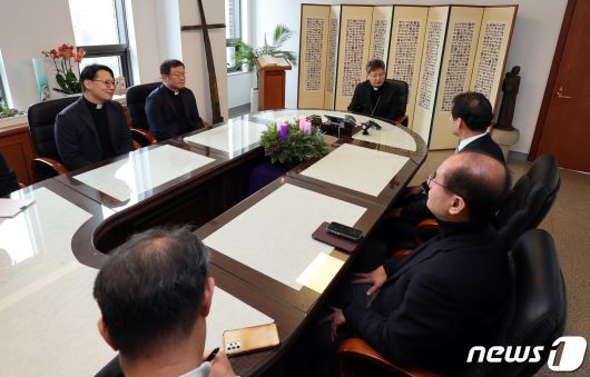 (서울=뉴스1) 김진환 기자 = 정순택 천주교 서울대교구장이 6일 오전 서울 중구 명동 서울대교구청을 방문힌 김영호 통일부 장관(오른쪽)과 대화를 나누고 있다. 2023.12.6/뉴스1kwangshinQQ@news1.krCopyright ⓒ 뉴스1. All rights reserved. 무단 전재 및 재배포, AI학습 이용 금지.